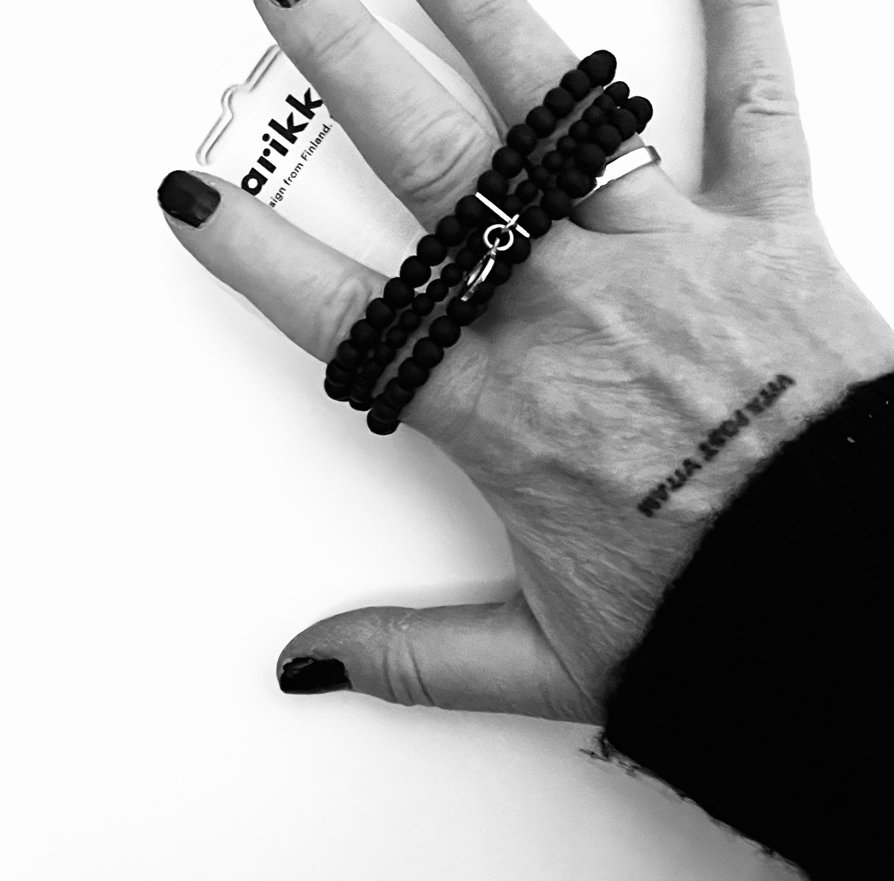 Elastiskt Neela Armband i tre lager pärlsträngar med handfärgade träpärlor i olika storlekar samt dekorerad med aarikkas a-logotyp. Färg Svart Material Lönn/Smyckesmetall/Elastisk tråd Längd Ø 6 cm, flexibel Handgjord i Finland