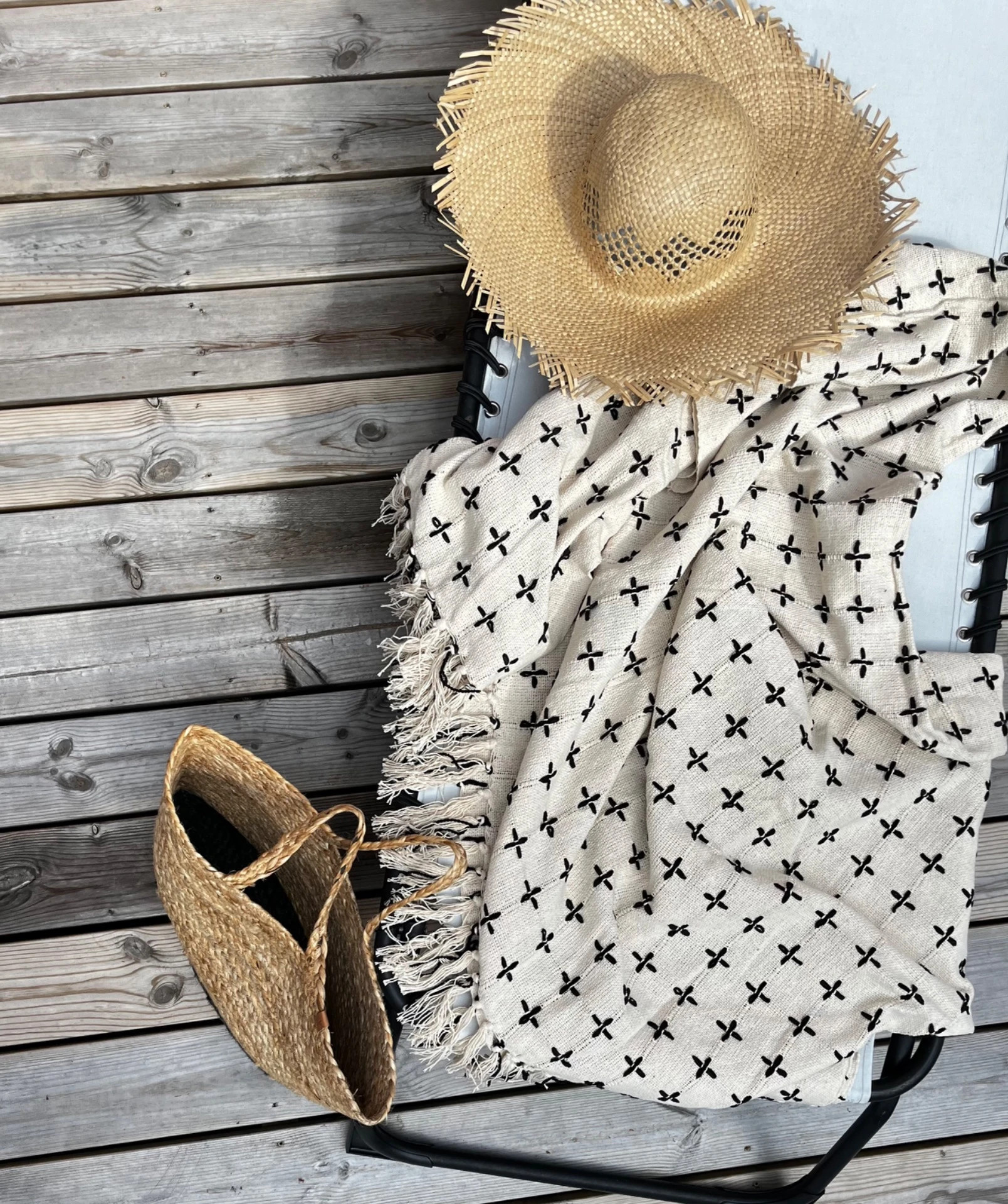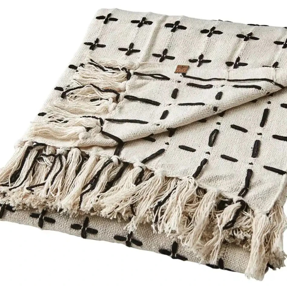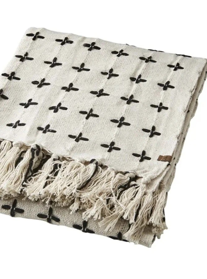 Filt MAJA i elfenbensfärg med broderade + + i svart garn. Lika fin i soffan, att hänga över en fåtölj eller till att ha med sig på stranden.Storl 175x125 cmMaterial Bomull/micropolyesterTvättråd Maskin eller handtvätt i 30˚C
