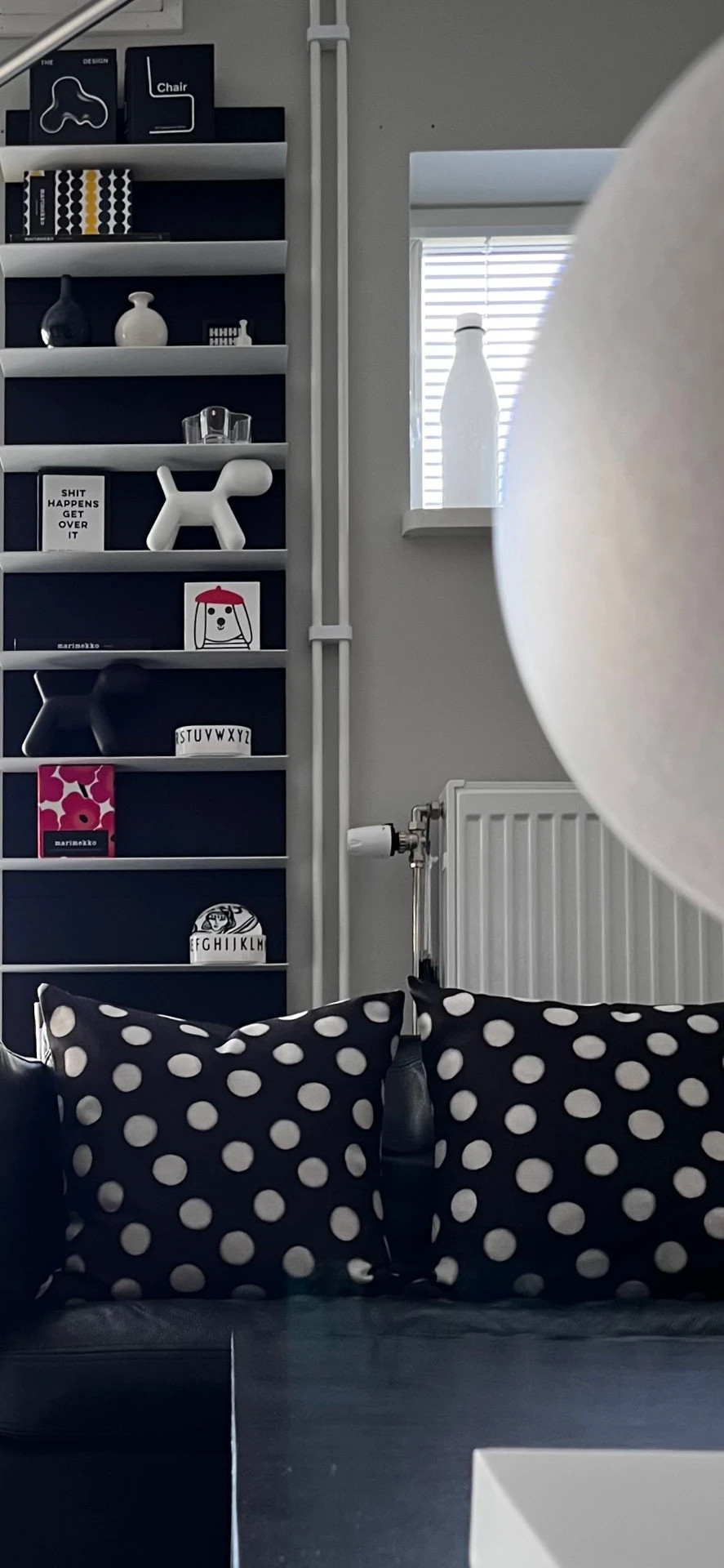 Kuddfodral tryckt med stilrena större prickar som har diffus kant. Kuddfodralet är 43x43cm och här blir det snyggast med en innerkudde på 50x50cm. Dubbelsidigt tryck samt dold dragkedja.