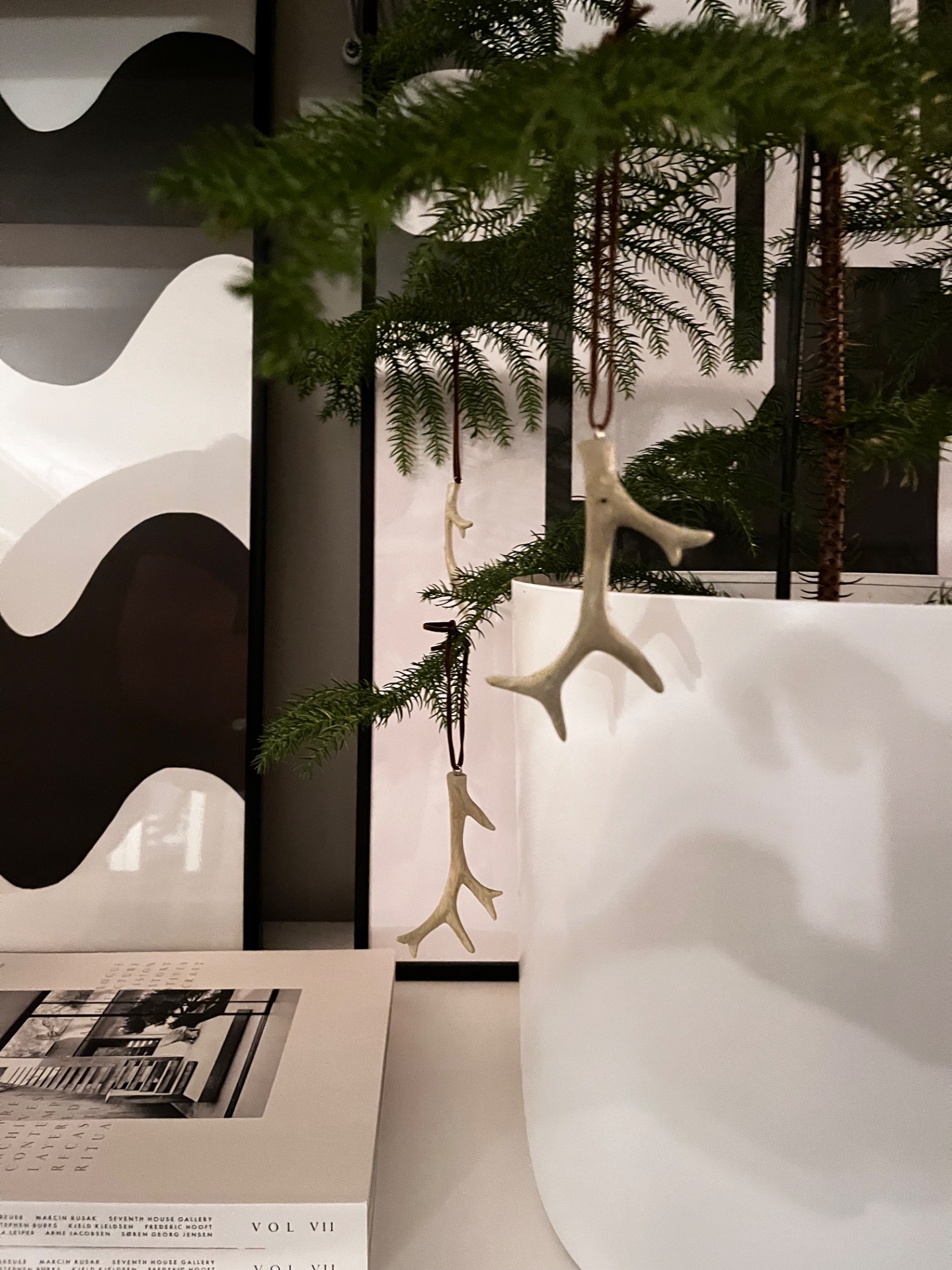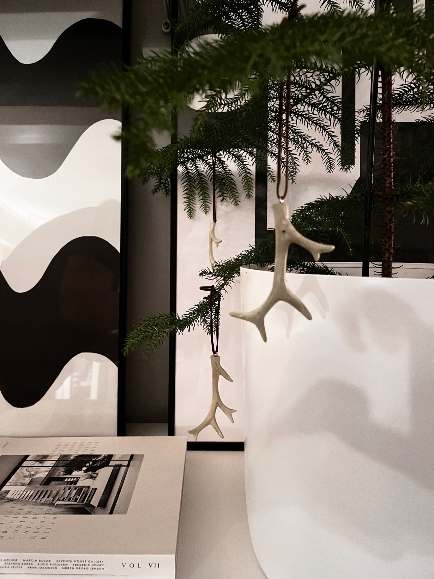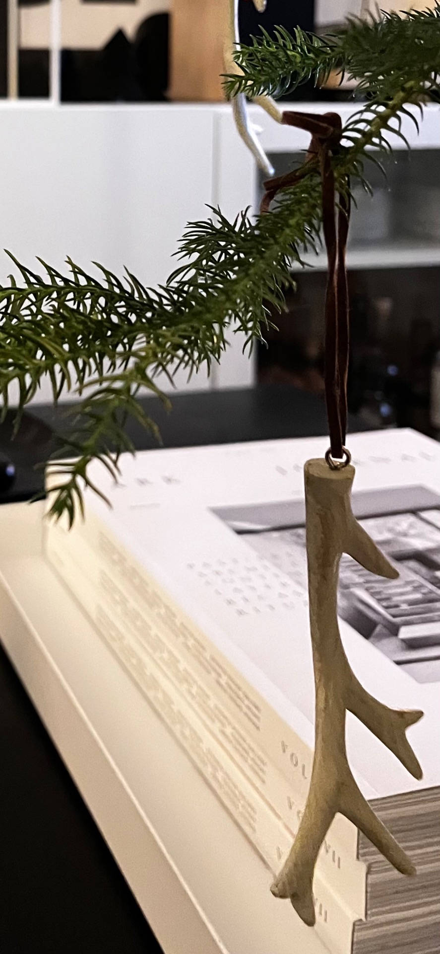 Naturtroget Renhornsinspirerat hänge med läderband. Så fin att dekorera med, häng den i granen eller dekorera olika detaljer med.