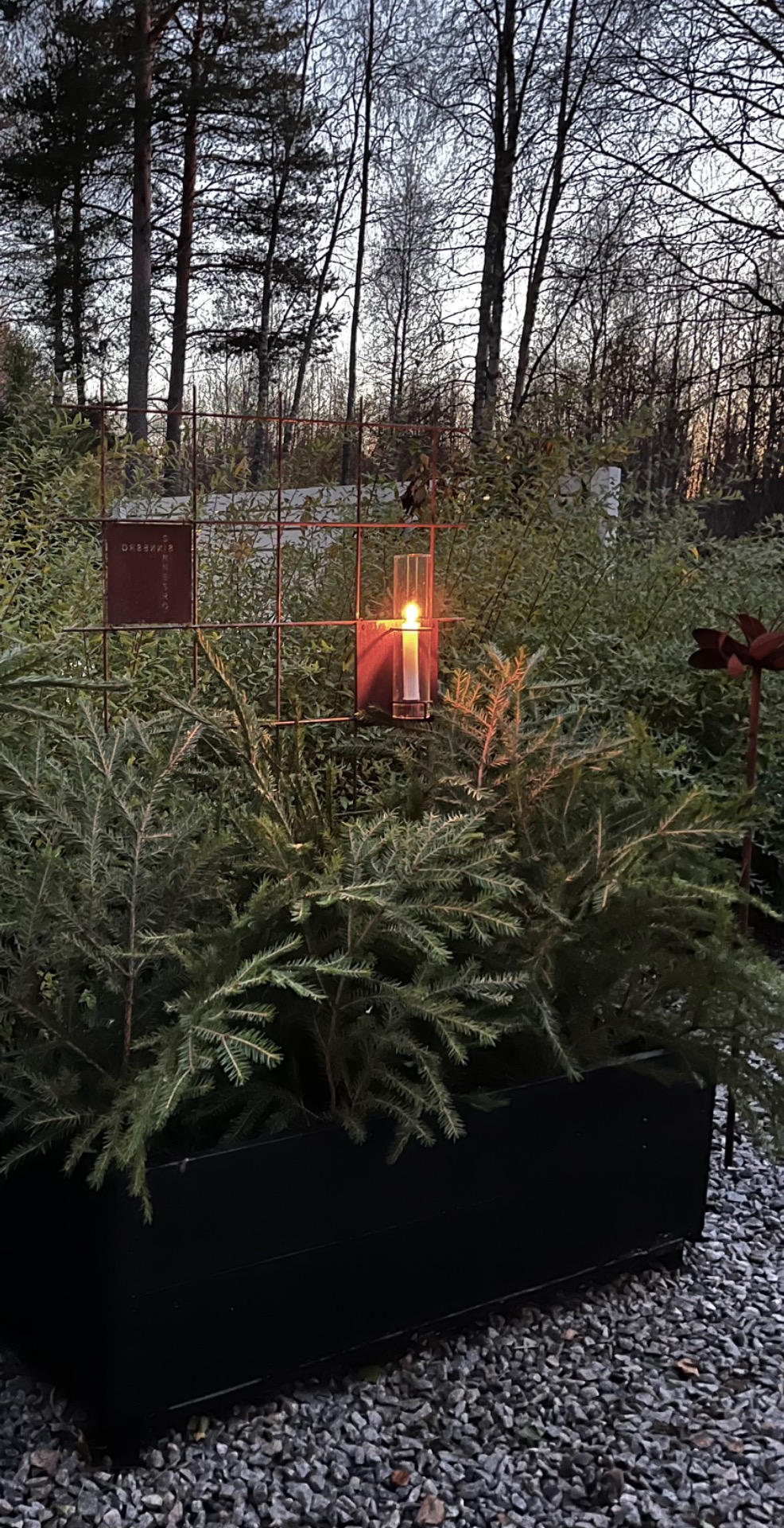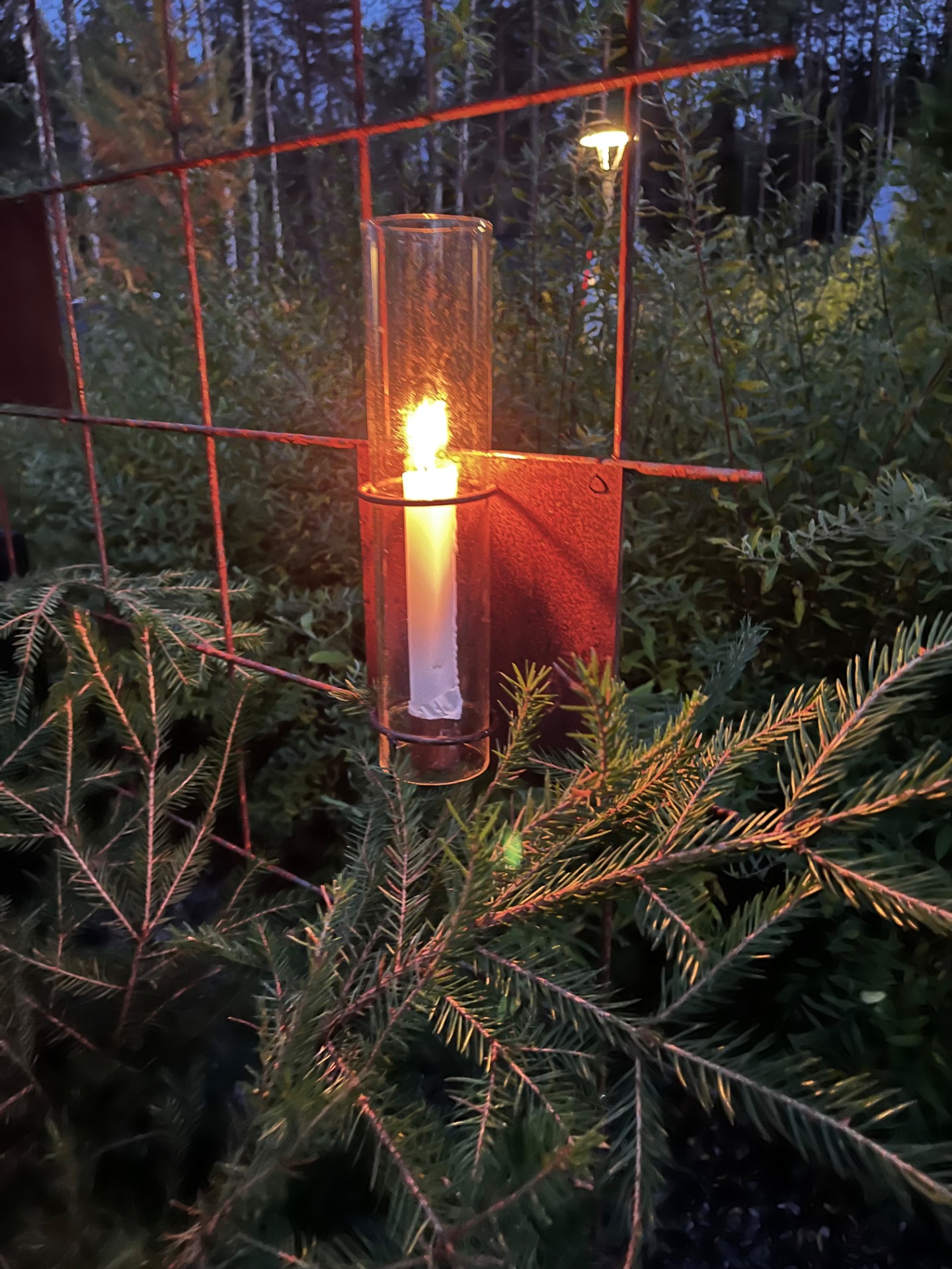 Dekorativ ljusstake med cylinderglas till armeringsnät, tillverkad i metall med rostig finish.