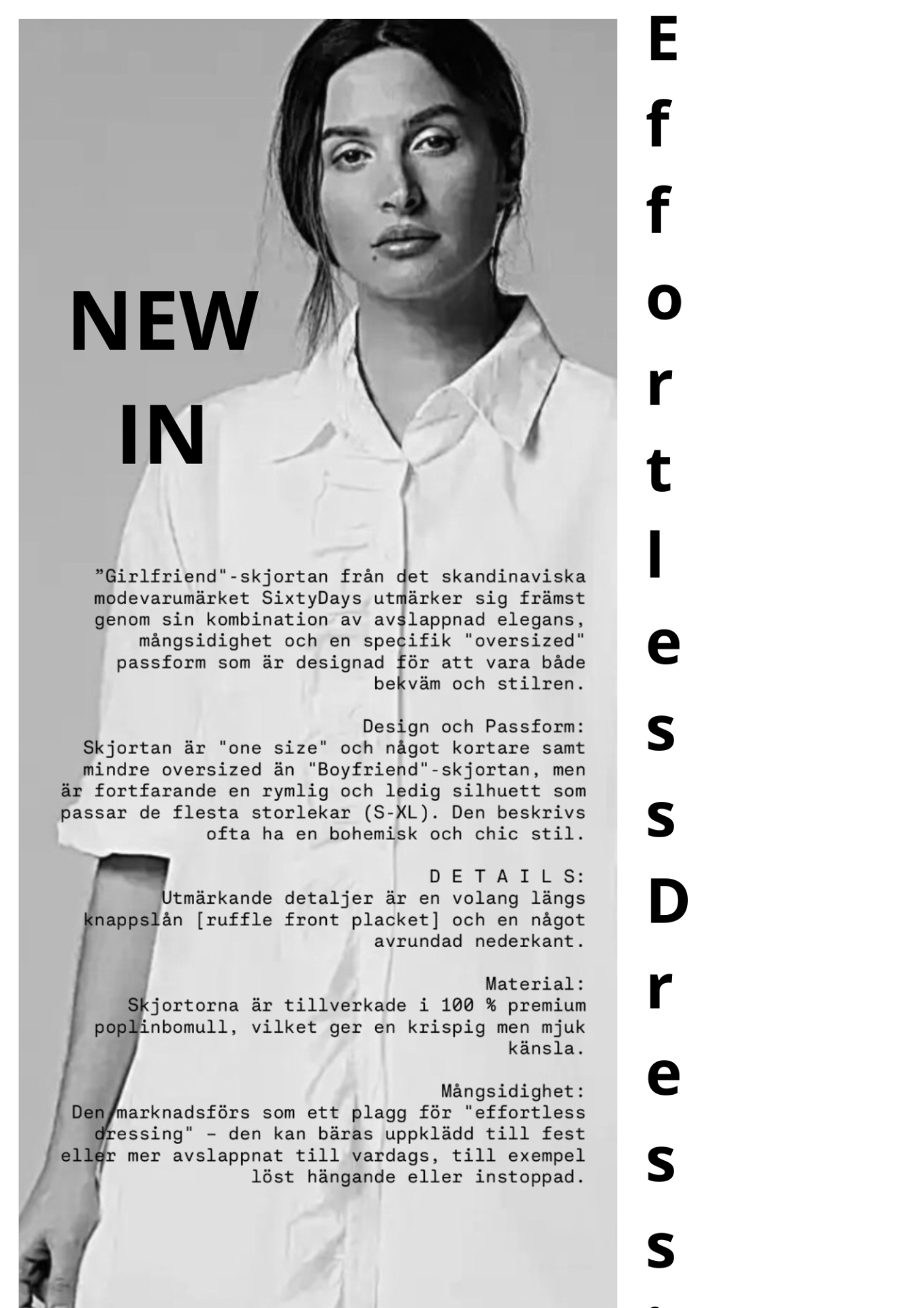 ”Girlfriend"-skjortan från det skandinaviska modevarumärket SixtyDays utmärker sig främst genom sin kombination av avslappnad elegans, mångsidighet och en specifik "oversized" passform som är designad för att vara både bekväm och stilren.