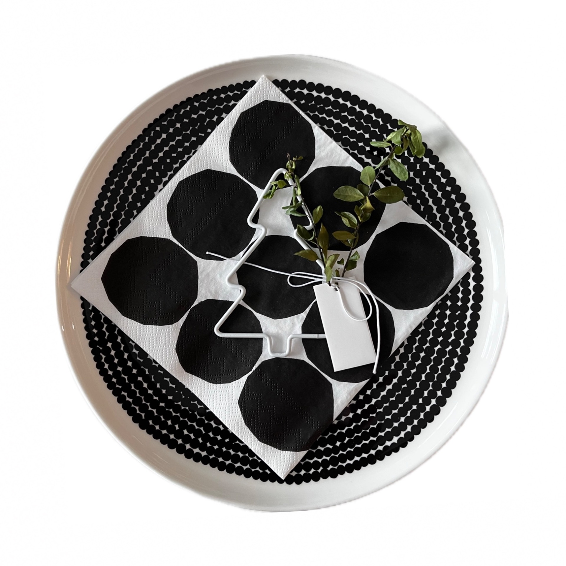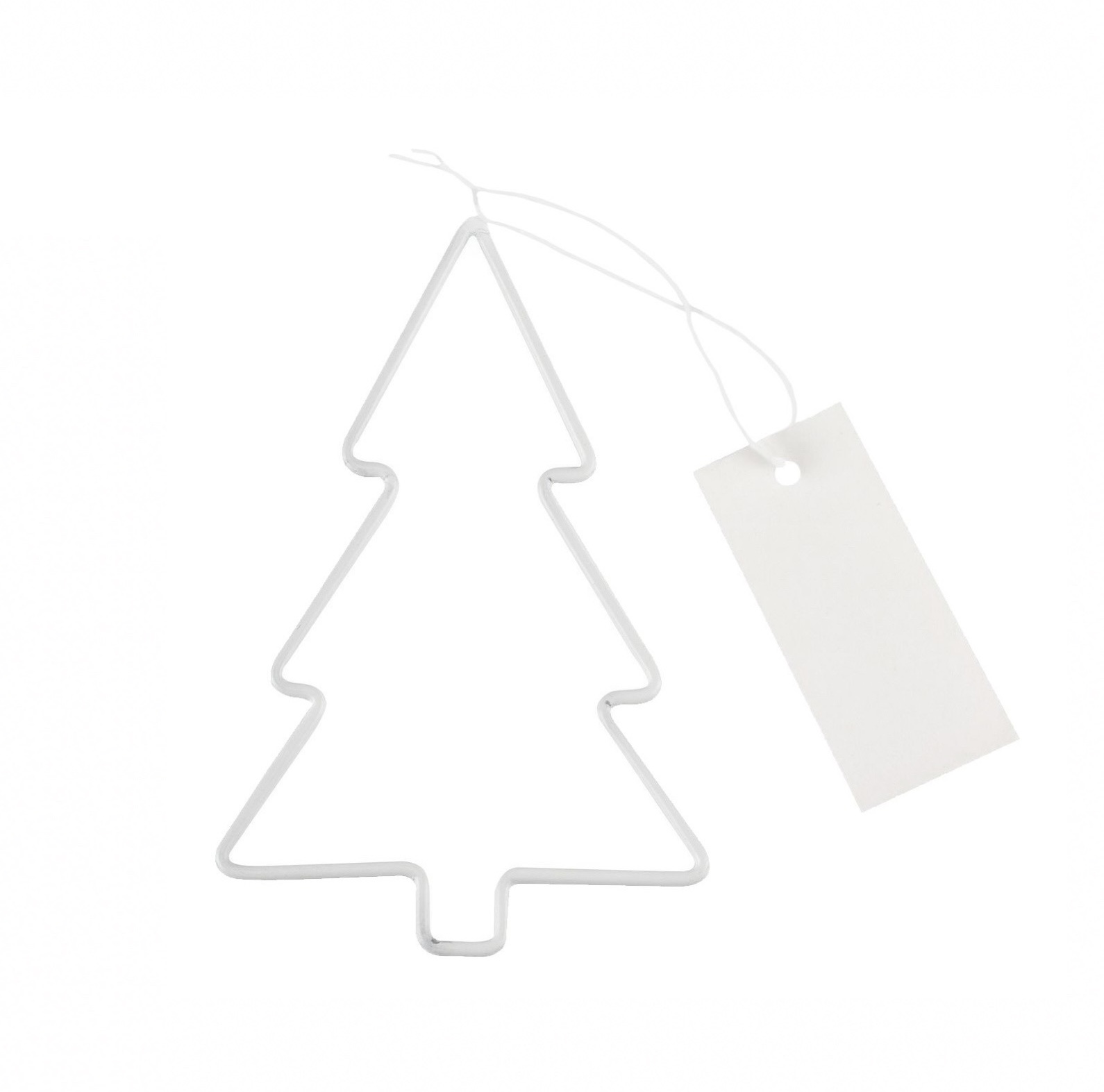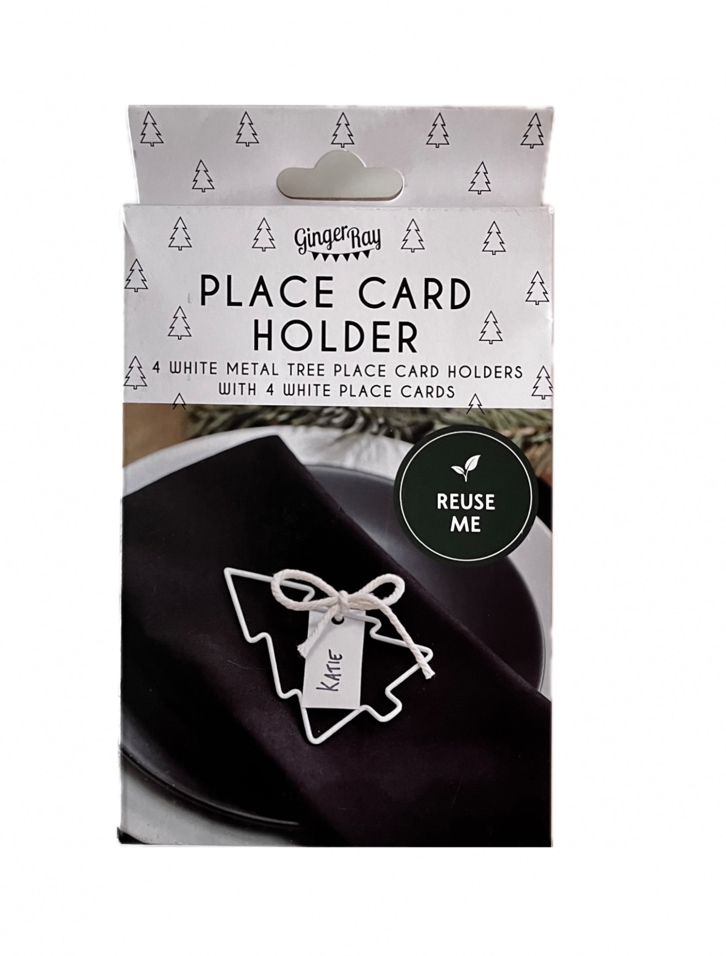 Placeringskort Gran består av 4 st granar i metall med ett vitt töjbart textilband och ett vitt kort på som du enkelt knyter fast i granen. En fin detalj till julbordet. Material MetallInkl. Korthållare, snöre och kortMått 11 x 7,5 cmAntal 4-pack
