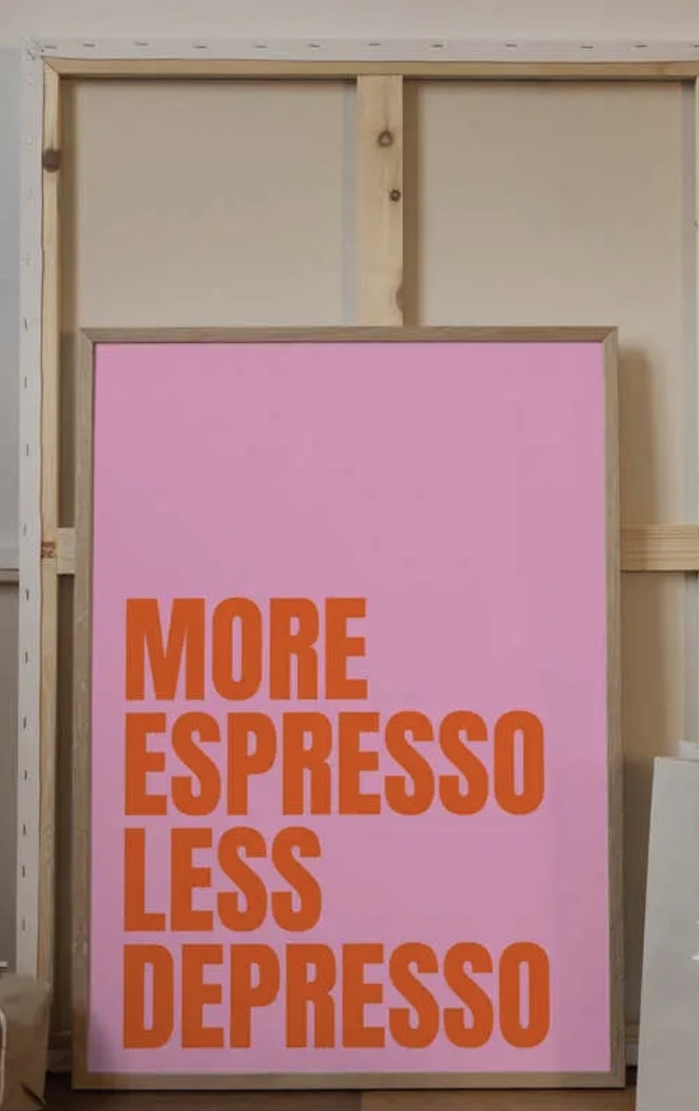 Typografisk Poster koffeinvibbar, med frasen More Espresso Less Depresso i fet orange text på en rosa bakgrund. Perfekt för att lägga till en touch av humor och färg i vilket rum som helst. Tryckt på obestruket 200g papperStorl 40x50cm Ram ingår ej