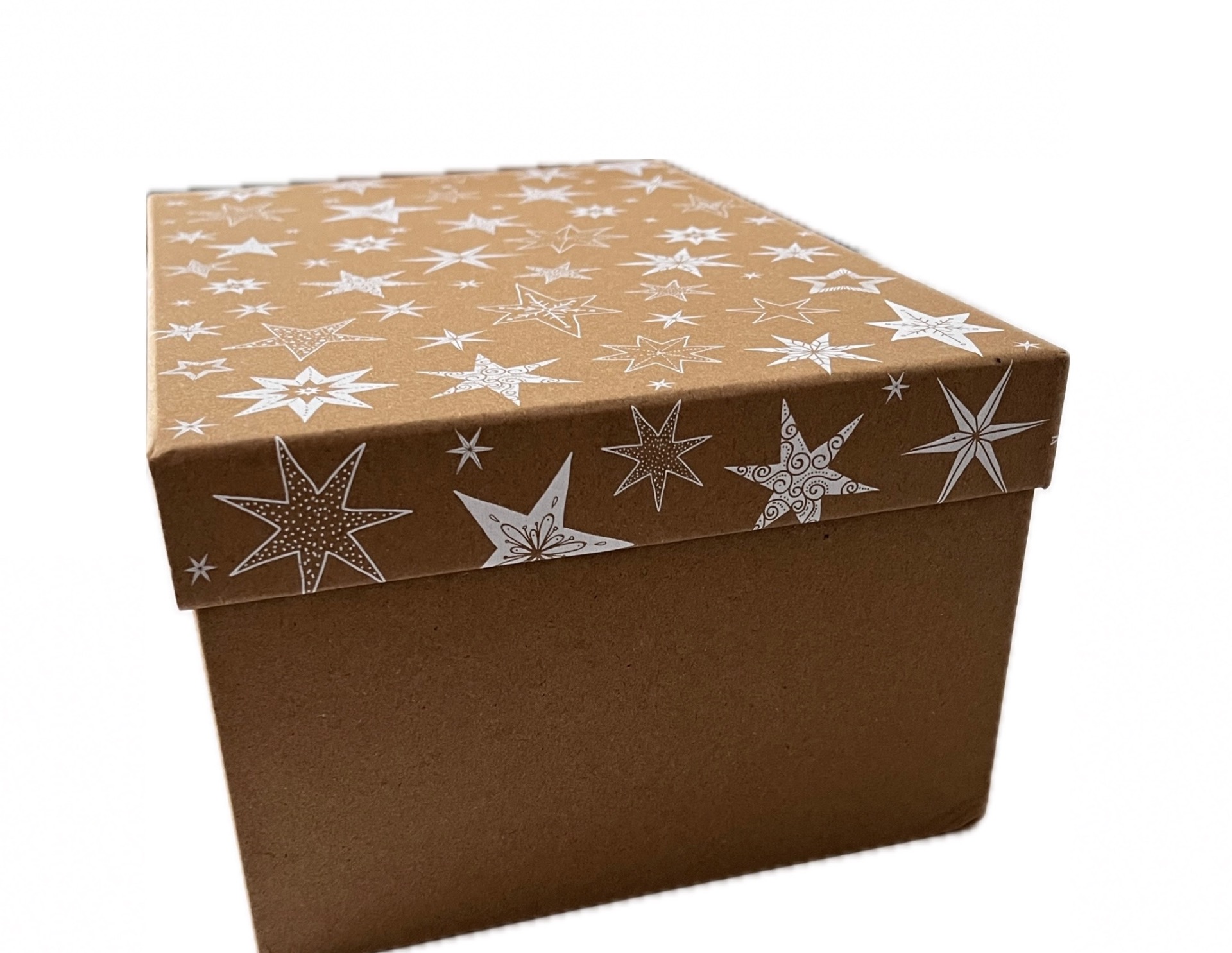 Presentlåda Jul med vita stjärnor, tillverkad i kraftig papp. Det här är den största av tre olika storl [se bilder]. Perfekt för dig som vill ha ett färdigt paket att fylla med klappar. för dig som vill ha ett färdigt paket att fylla med klappar.