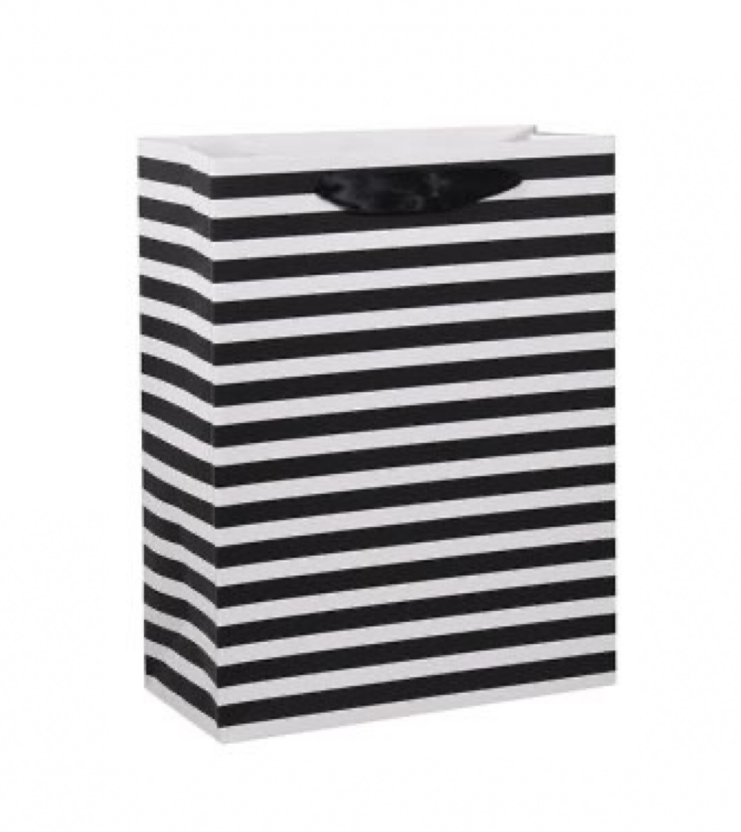 Presentera din gåva i en vacker förpackning, och få mottagaren att känna sig uppskattad. Den här stadiga påsen/väskan med klassiska ränder i svart/vitt har satinband som handtag.
